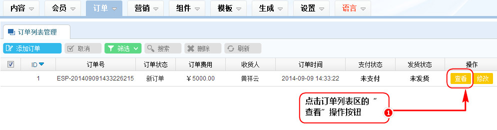 1、在訂單列表管理區,點擊訂單列表區的“查看”操作按鈕,或者雙擊需要查看的訂單列表;