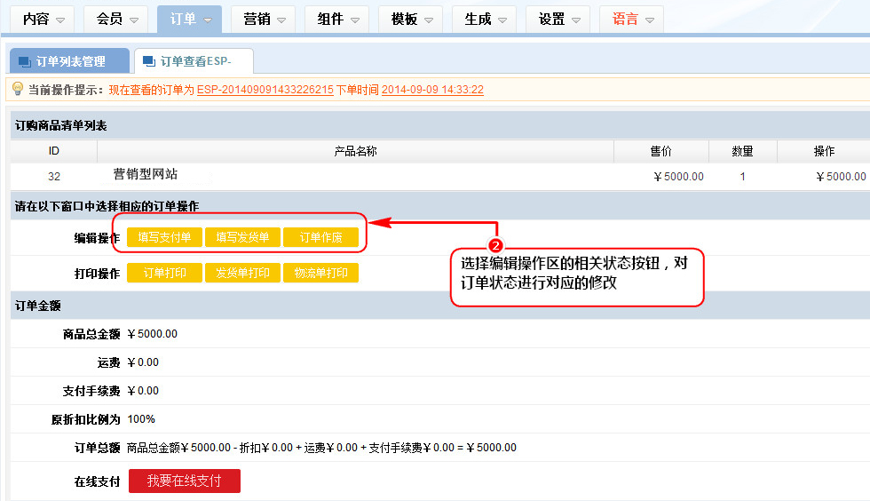 2、要出來的訂單查看窗口中,選擇編輯操作區的相關狀態按鈕,對訂單進行對應的修改;