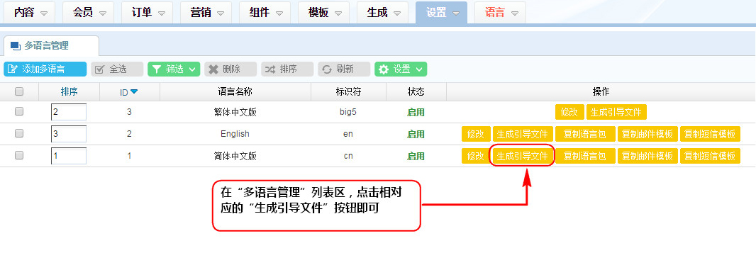 1、在“多語言管理”列表區,點擊相對應的“生成引導文件”按鈕即可;