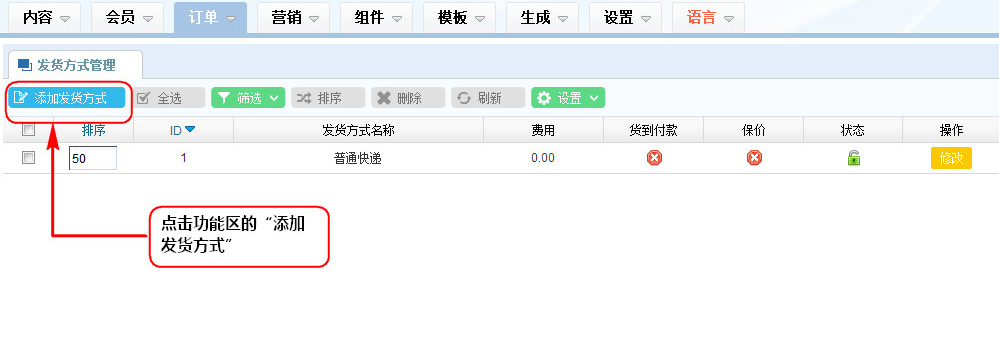 1、在發貨方式管理當前窗口區,點擊功能區的“添加發貨方式”;