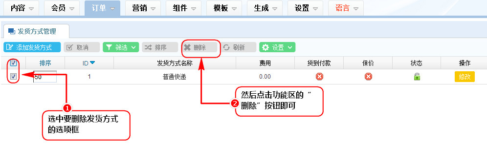 1、在發貨方式列表管理區,選中要刪除發貨方式的選項框;