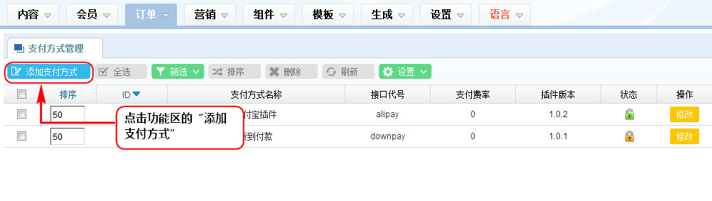 3、說明:如果添加第三方支付方式,須向相關支付方式網站申請相關的支付接口信息,申請好后按支付接口表單屬性填寫即可。