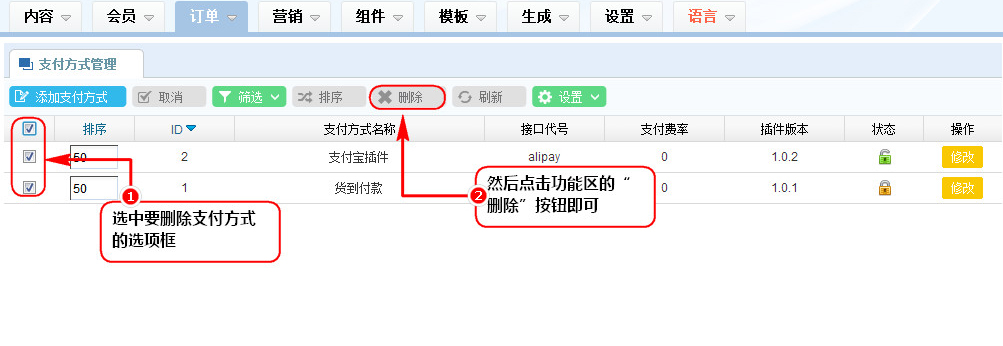 1、在支付方式列表管理區(qū),選中要?jiǎng)h除支付方式的選項(xiàng)框;