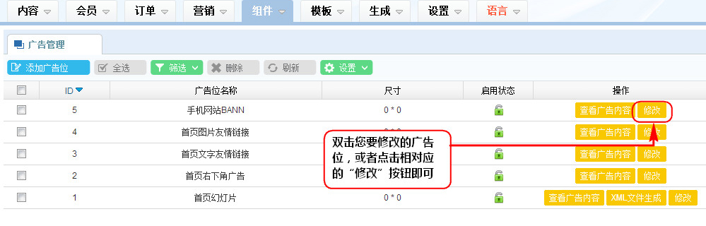 1、在廣告位管理列表區(qū)雙擊您要修改的廣告位,或者點(diǎn)擊相對(duì)應(yīng)的“修改”按鈕即可;
