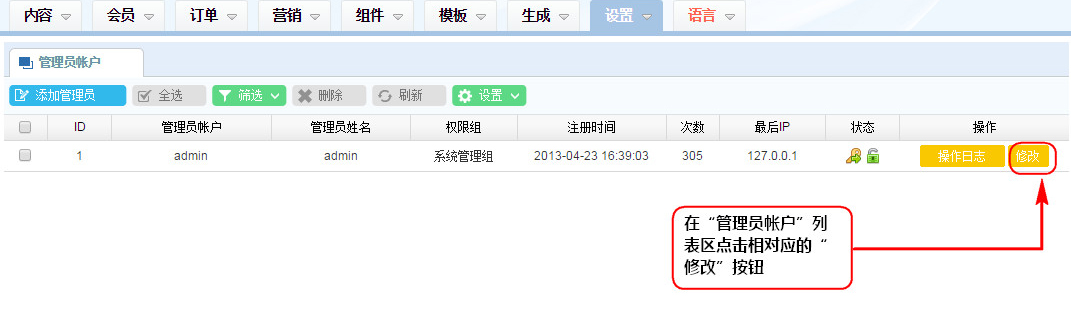 1、在“管理員帳戶”列表區(qū)點擊相對應(yīng)的“修改”按鈕;