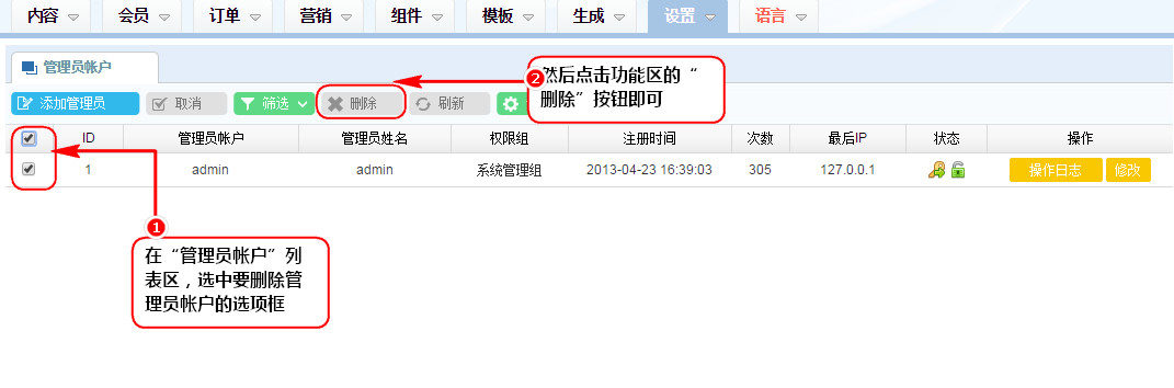 1、在“管理員帳戶”列表區,選中要刪除管理員帳戶的選項框;