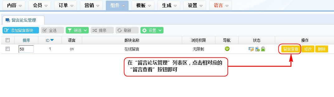 1、在“留言論壇管理”列表區,點擊相對應的“留言查看”按鈕即可;