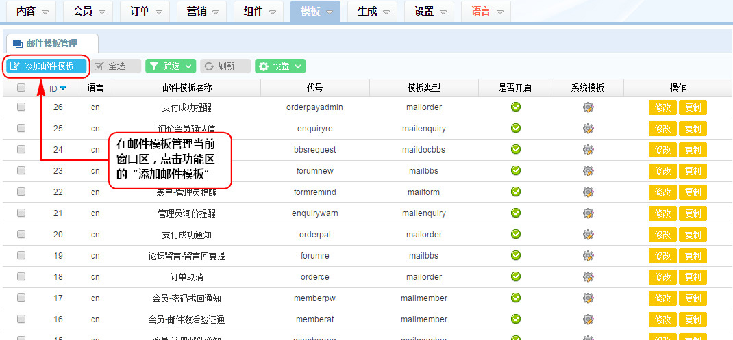 1、在郵件模板管理當前窗口區(qū),點擊功能區(qū)的“添加郵件模板”;