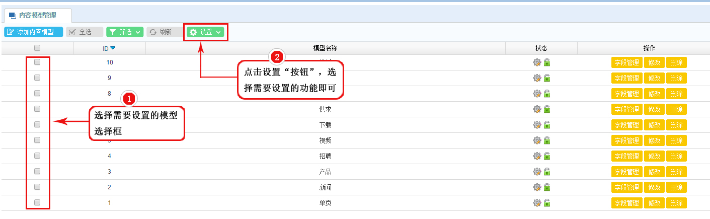 1、在模型管理列表區(qū),選中需要設(shè)置的模型選項框;