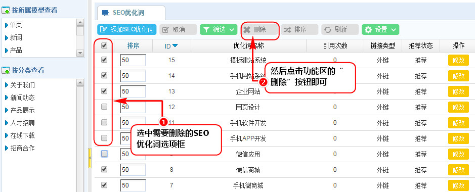 1、在SEO優化詞管理列表區,選中需要刪除的SEO優化詞選項框;