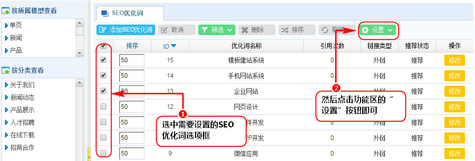 1、在SEO優(yōu)化詞管理列表區(qū),選中需要設(shè)置的SEO優(yōu)化詞選項(xiàng)框;