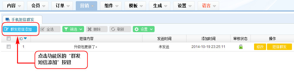 1、在手機短信群發列表區,點擊功能區的“群發短信添加”按鈕;