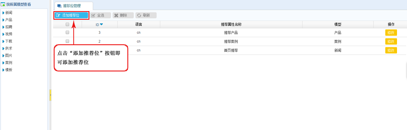 1、在推薦位管理列表區,點擊功能區的“添加推薦位”按鈕;