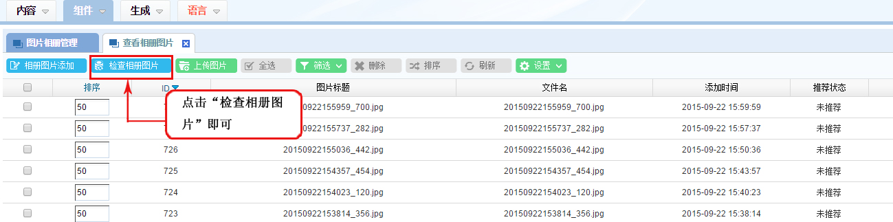 1、在“查看相冊(cè)圖片”窗口區(qū),點(diǎn)擊功能區(qū)的“檢查相冊(cè)圖片”;