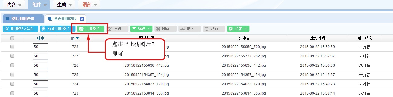 1、在“查看相冊圖片”窗口區,點擊功能區的“上傳圖片”;