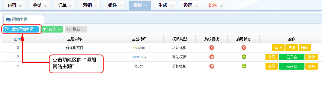 4、說明:在添加網站主題過程中,主題文件夾名稱必須與templates中的模板主題文件夾名稱一致。