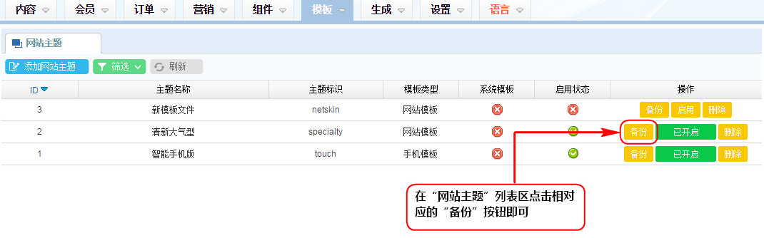 1、在“網(wǎng)站主題”列表區(qū)點擊相對應的“備份”按鈕即可;
