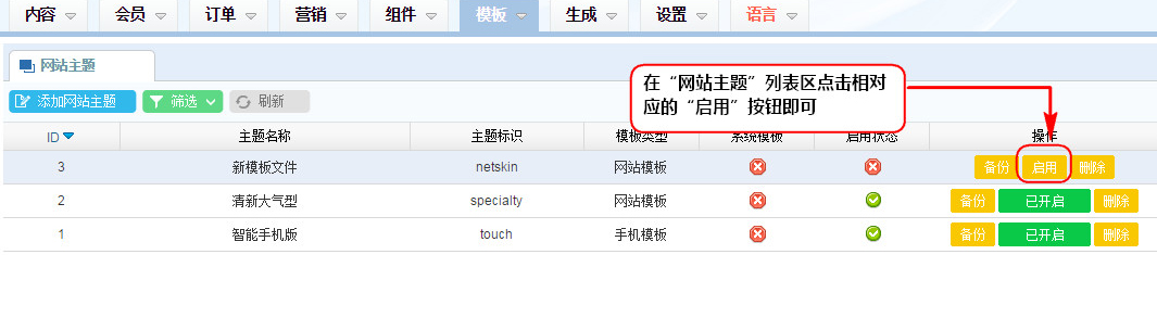 1、在“網(wǎng)站主題”列表區(qū)點擊相對應的“啟用”按鈕即可;