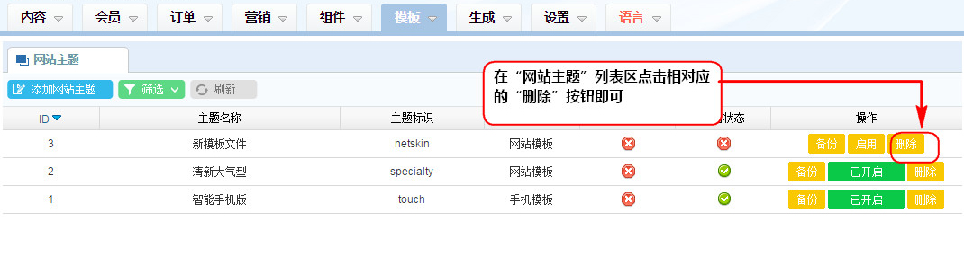 1、在“網站主題”列表區點擊相對應的“刪除”按鈕即可;