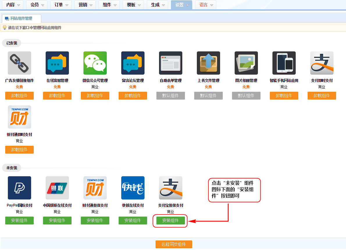 2、點擊“未安裝”組件圖標下面的“安裝組件”按鈕即可;