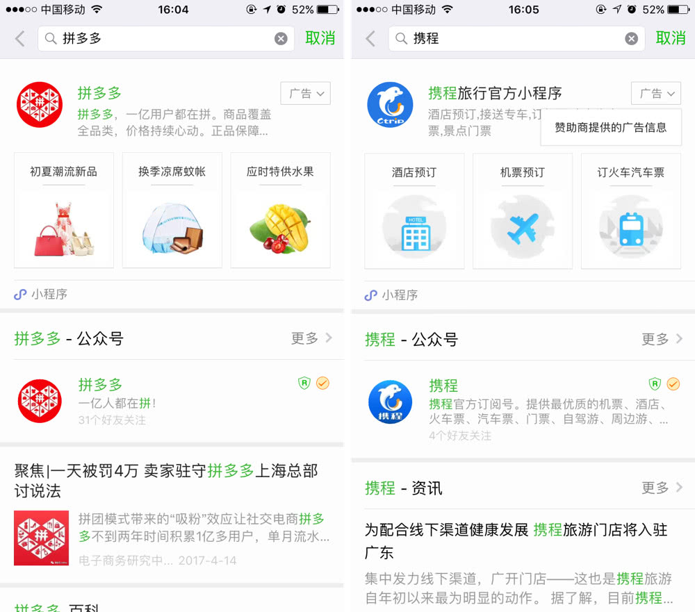 最近,我們接到內部消息稱:微信正在測試 搜索廣告(通過搜索能直接進入小程序內容)和公眾號插播小程序(小程序與公眾號不需要關聯)。