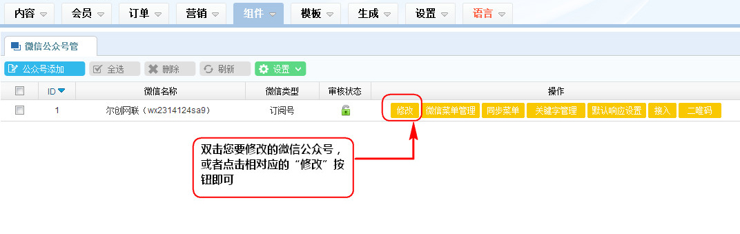 1、在微信公眾號管理列表區(qū)雙擊您要修改的微信公眾號,或者點擊相對應的“修改”按鈕即可;