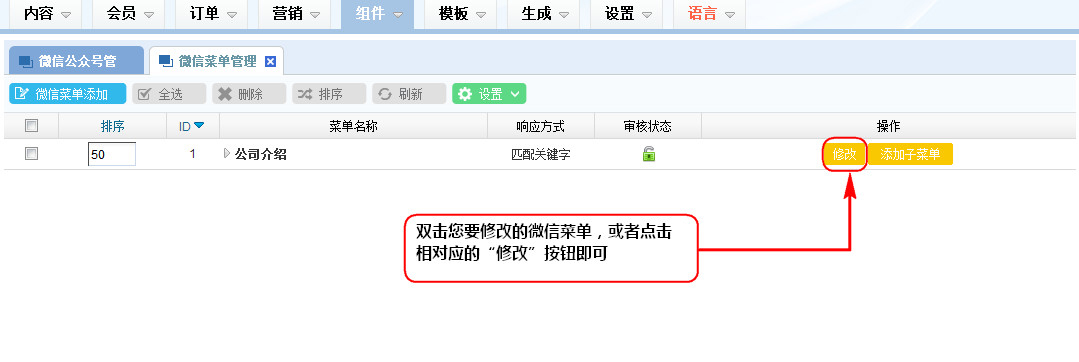 1、在微信菜單管理列表區(qū)雙擊您要修改的微信菜單,或者點擊相對應(yīng)的“修改”按鈕即可;