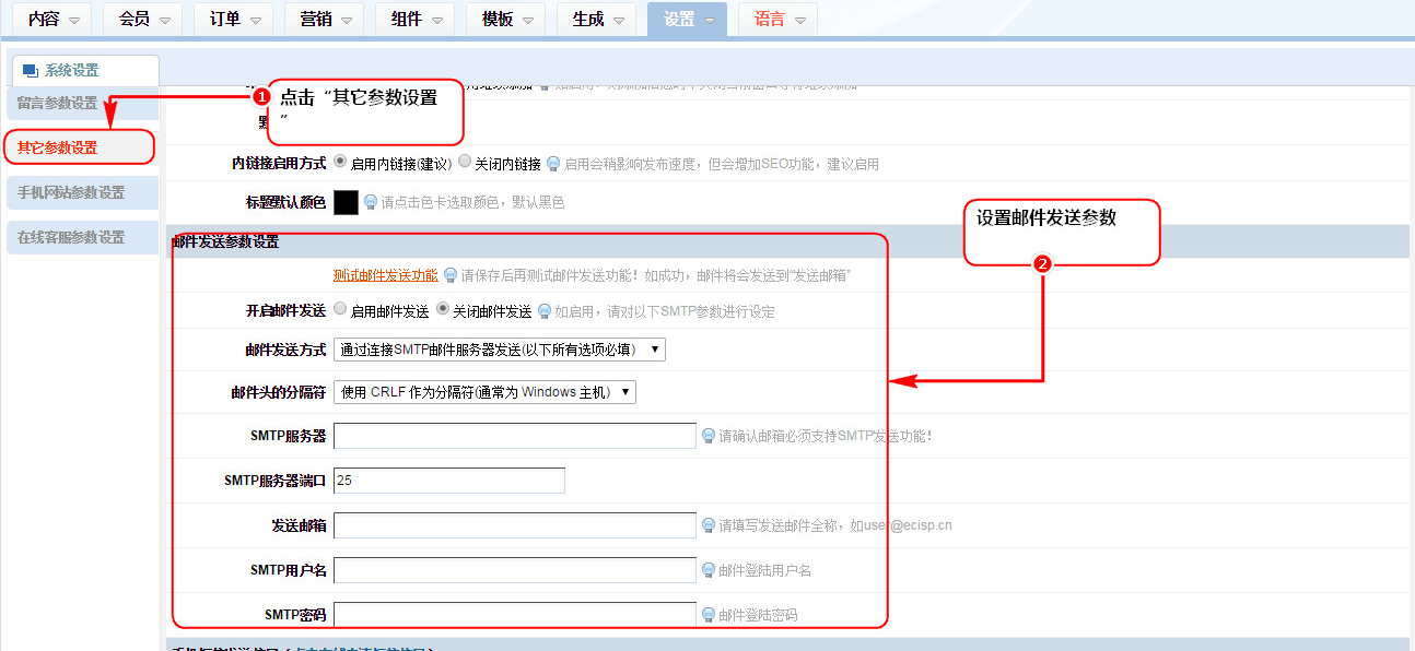 1、開啟郵件發送:啟用或關閉網站郵件發送功能,如啟用,需對SMTP參數進行設定;