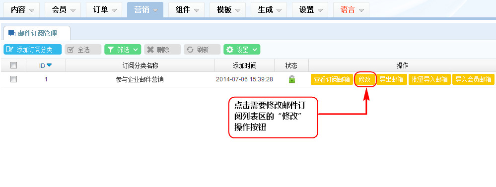 1、在郵件訂閱管理區(qū),點擊需要修改郵件訂閱列表區(qū)的“修改”操作按鈕;