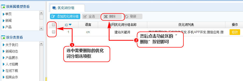 1、在優化詞分組管理列表區,選中需要刪除的優化詞分組選項框;
