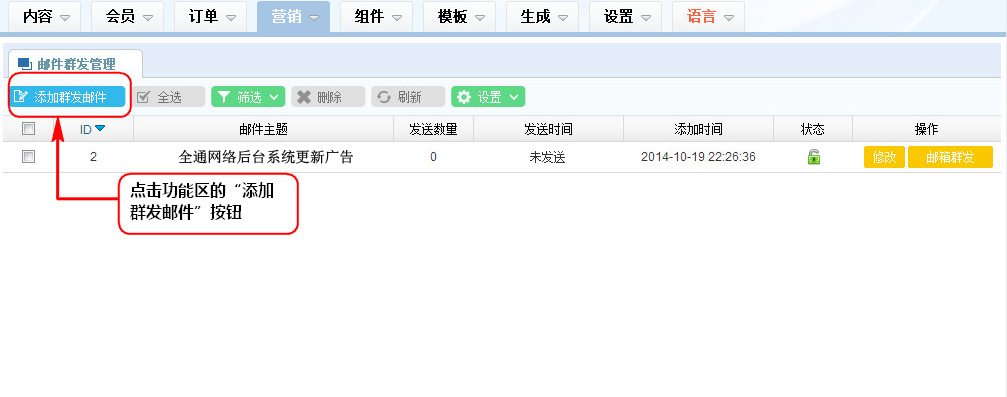 1、在郵件群發(fā)列表區(qū),點(diǎn)擊功能區(qū)的“添加群發(fā)郵件”按鈕;
