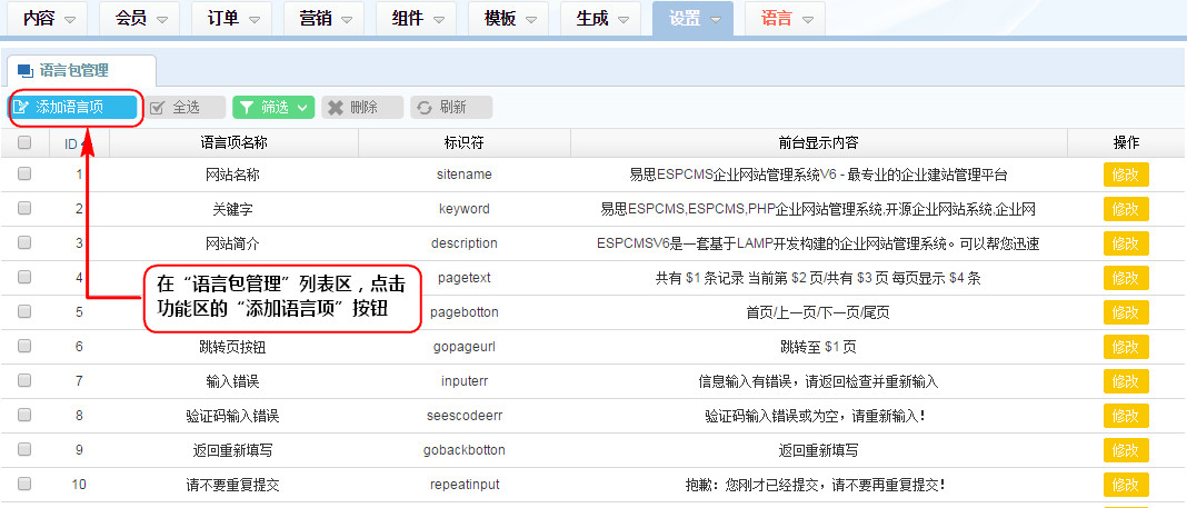 1、在“語言包管理”列表區(qū),點擊功能區(qū)的“添加語言項”按鈕;
