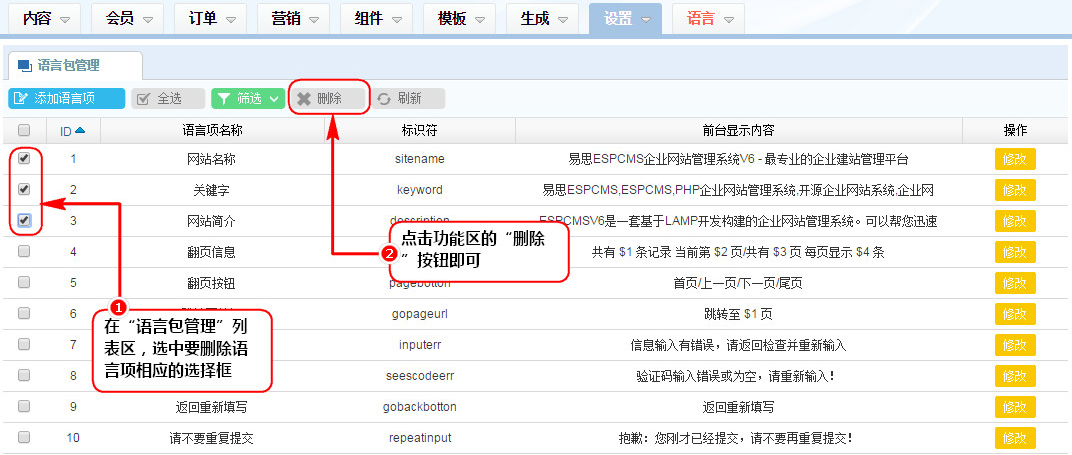 3、說明:默認語言項禁止刪除,只能刪除自定義的語言項。