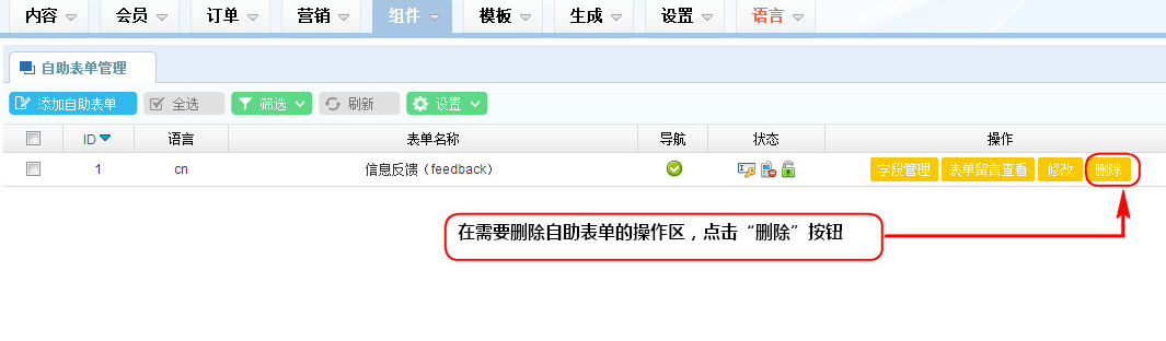 2、說明:刪除自助表單后,相關(guān)自助表單留言內(nèi)容也會(huì)刪除,請(qǐng)謹(jǐn)慎操作。