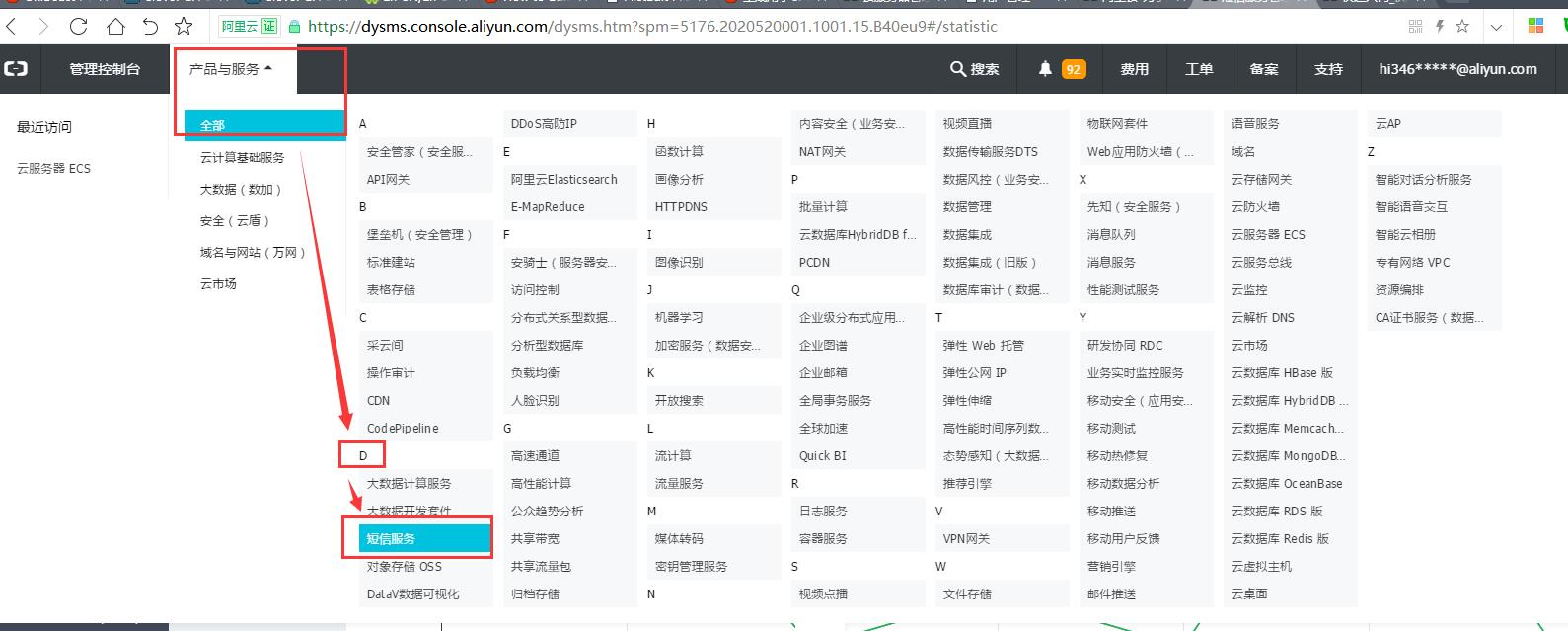 1. 登錄阿里云選擇短信功能(若提示無法注冊,則是之前使用過阿里大于,請登錄https://dayu.aliyun.com/ 阿里大于進(jìn)行操作 )