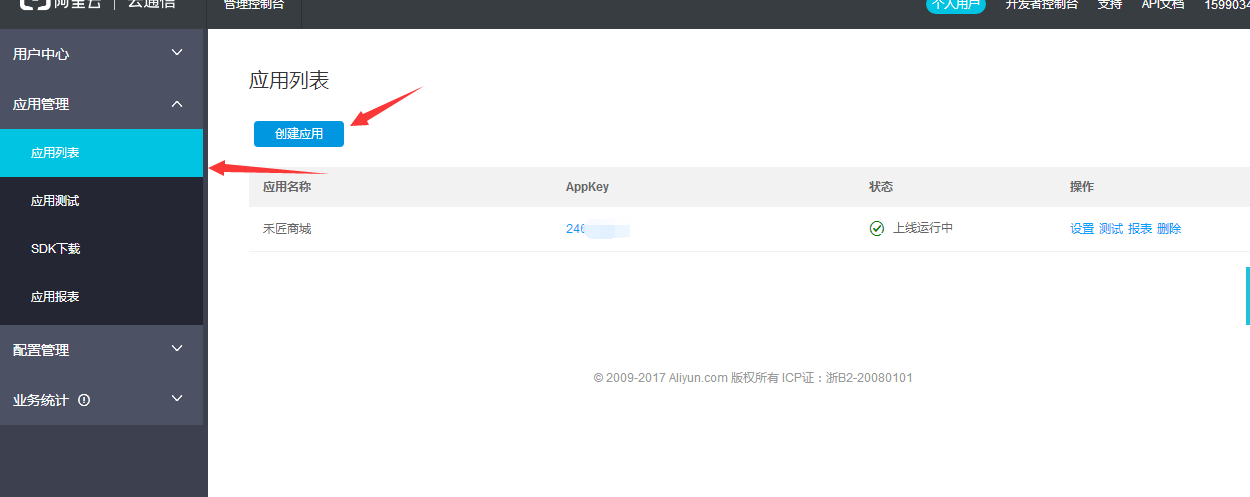 1. 首先進(jìn)入阿里大于創(chuàng)建應(yīng)用