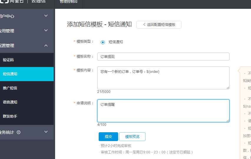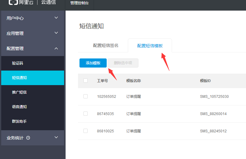 6. 配置好短信簽名,配置短信模版