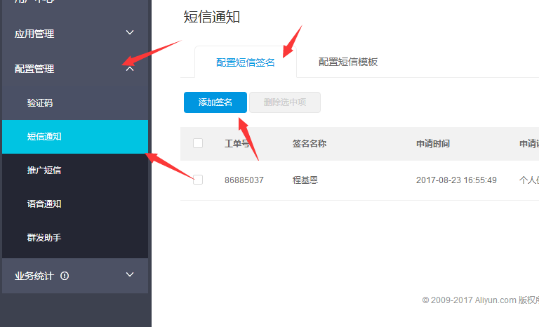 點(diǎn)擊配置管理-短信通知-添加簽名
