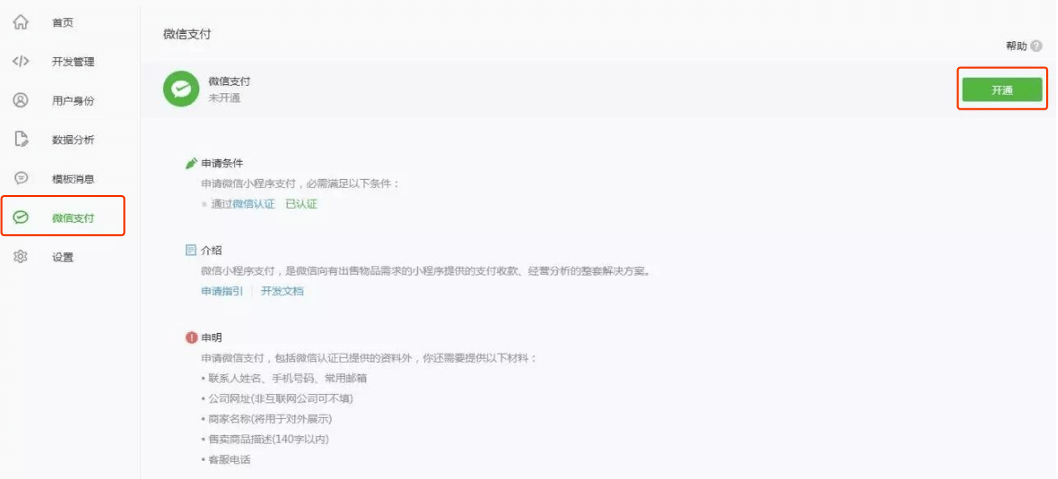 操作路徑:登錄微信小程序后臺(tái) -> 微信支付 -> 開通,進(jìn)入后請(qǐng)按照微信的指引操作。注意:如果是通過(guò)公眾號(hào)快速注冊(cè)的小程序,開通微信支付的時(shí)候可以服用公眾號(hào)支付資質(zhì)