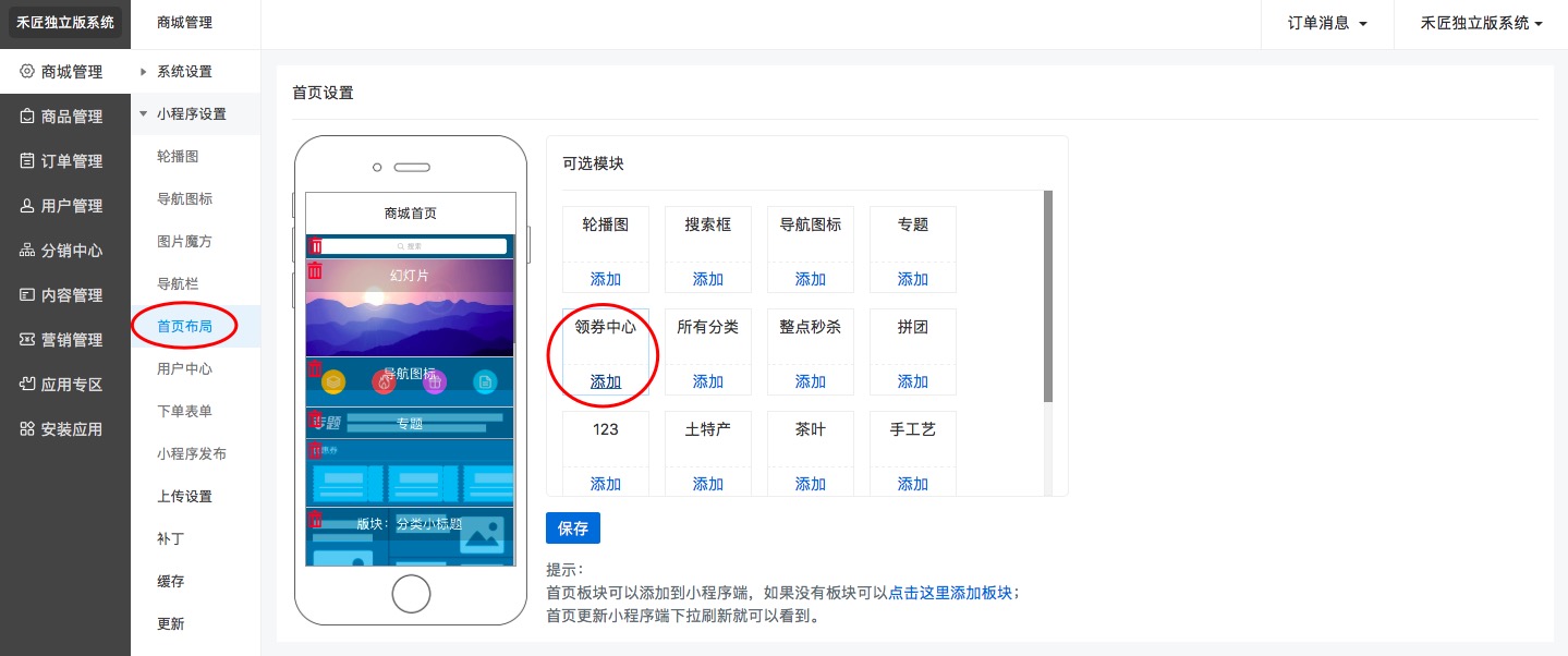 是因為沒有到“商城管理”—>“小程序設置”—>“首頁布局”